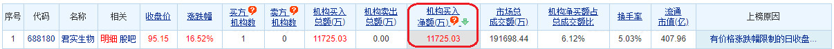 龙虎榜数据显示,买入君实生物金额最大的前五名中,有1家机构专用席位。经统计,今日君实生物的机构席位净买入金额为11725.03万元。