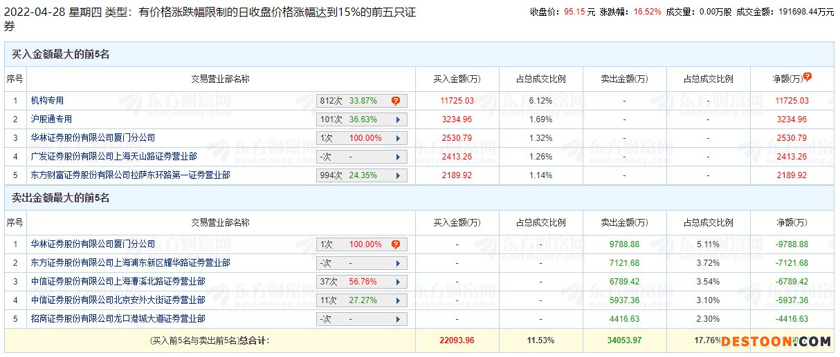 中国经济网北京4月28日讯 截至今日收盘,君实生物(688180.SH)上涨,收报95.15元,涨幅16.52%。龙虎榜数据显示,买入君实生物金额