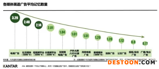 凯度《2021年中国城市居民广告关注度研究》显示:来自电梯媒体、社交媒体和短视频平台的广告更能让消费者记住品牌,其中电梯媒体以3.29的人均广告记忆数拔得头筹。