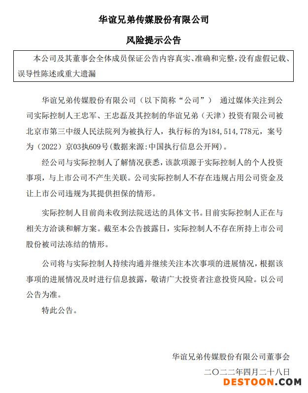 中新经纬4月28日电 28日,华谊兄弟公告称,通过媒体关注到公司实际控制人王忠军、王忠磊及其控制的华谊兄弟(天津)投资有限公司被北京市第三中级人民法院列为被执行人,执行标的为1.85亿元;经公司与实际控制人了解情况获悉,该款项源于实际控制人的个人投资事项,与上市公司不产生关联。
