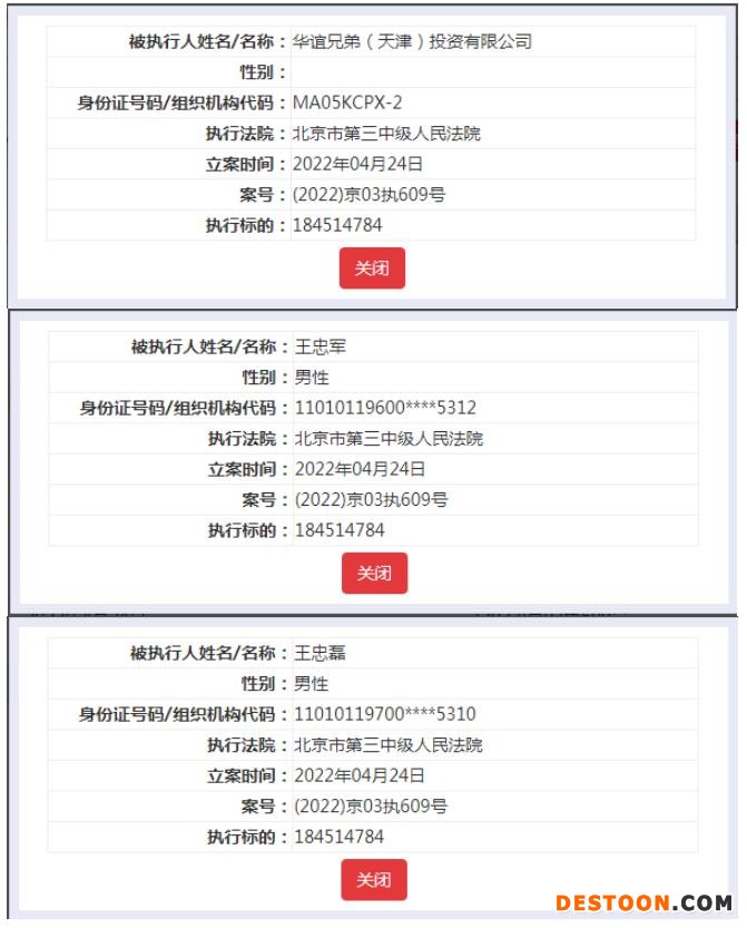 根据中国执行信息公开网显示,华谊兄弟(天津)投资有限公司、王忠军、王忠磊等近日新增一条被执行人信息,执行标的1.85亿元,执行法院为北京市第三中级人民法院,案号为(2022)京03执609号。