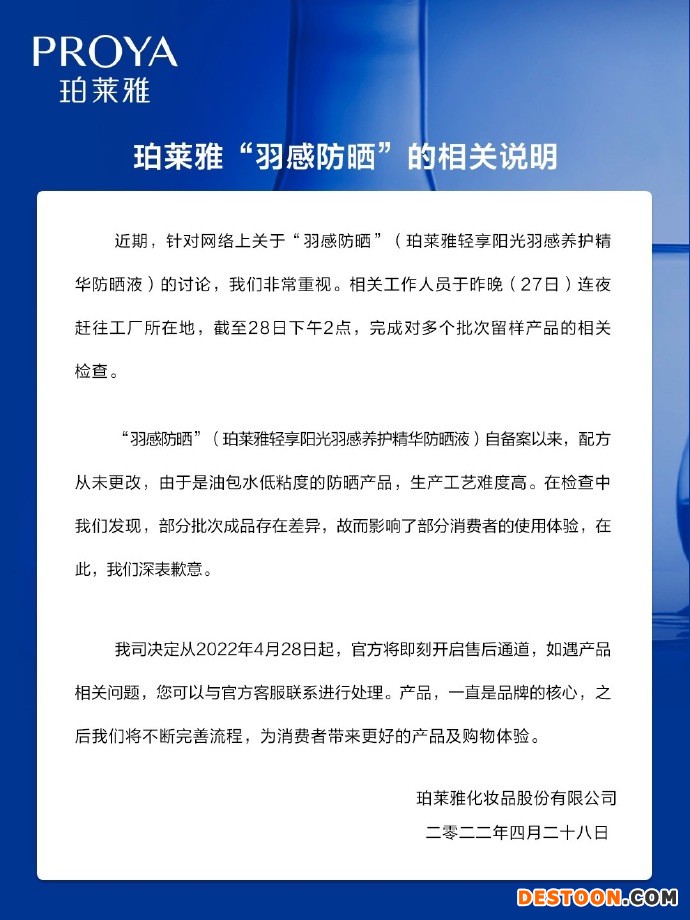 声明称, “羽感方晒”(珀莱雅轻享阳光羽感养护精华题液)自备案以来,配方从未更改,由于是油包水低粘度的防晒产品,生产工艺难度高。在检查中我们发现,部分批次成品存在差异,故而影响了部分消费者的使用体验,在此,我们深表歉意。