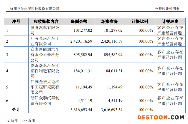 记者注意到,报告期各期末,良淋电子按单项计提坏账准备的应收账款涉及的客户,也多是汽车厂商及汽车零部件企业。公开转让说明书(申报稿)显示,以2021年10月末为例,由于客户企业存在严重经营问题,良淋电子对6家客户的361.67万元应收账款进行了全额坏账准备计提,涉及客户包括汉腾汽车有限公司(以下简称汉腾汽车)、江苏金坛汽车工业有限公司(以下简称金坛汽车)、众泰新能源汽车有限公司长沙分公司等,其中坏账准备金额最大的是金坛汽车的242.01万元。