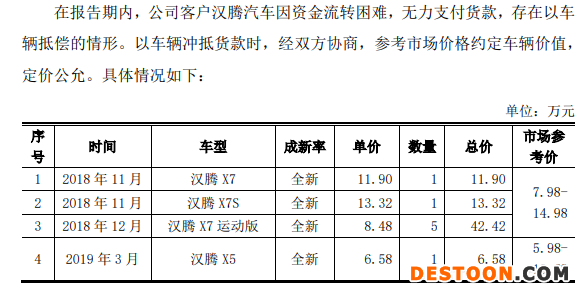 值得注意的是,在款项回收方面,公司还遇到汽车客户无力偿还款项、以汽车等资产抵偿的情形。客户汉腾汽车因资金流转困难,无力支付货款,2018年~2019年,汉腾汽车将8辆全新汽车用于冲抵货款,车辆总价共计74.22万元。良淋电子表示,定价经公司与汉腾汽车参考市场价格协商确定,与市场价格不存在重大差异。