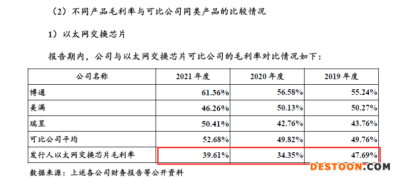 这也导致盛科通信的以太网交换芯片毛利率低于可比公司,2019年~2021年,盛科通信的以太网交换芯片毛利率分别为47.69%、34.35%和39.61%,可比公司平均毛利率为49.76%、49.82%和52.68%。