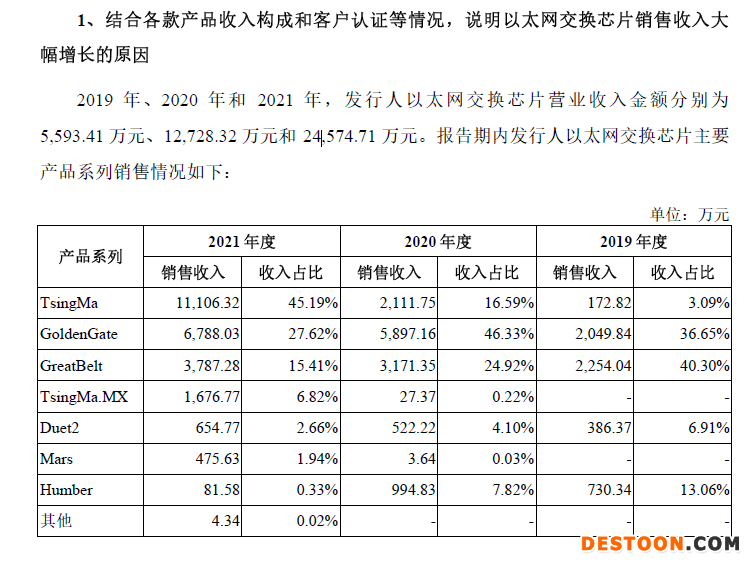 按照审核问询函的回复,2019年~2021年,盛科通信以太网交换芯片收入前三的产品为TsingMa、GoldenGate和GreatBelt。其中TsingMa收入增长最快,2019年~2021年销售收入分别为172.82万元、2111.75万元和1.11亿元;GoldenGate则是2019年、2020年收入最高的芯片产品,2021年才被TsingMa超过,过去三年销售收入分别为2049.84万元、5897.16万元、6788.03万元。