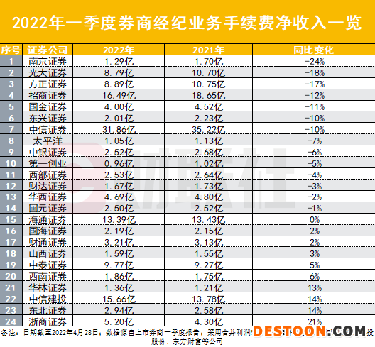图为截至4月29日2022年一季度券商经纪业务手续费净收入一览