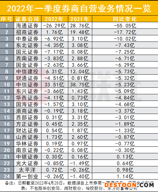 图为截至4月28日2022年一季度券商自营业务情况一览