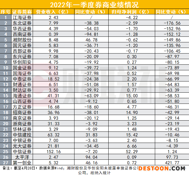 图为截至4月28日券商2022年一季度业绩情况,湘财股份及华创安阳未披露单独证券公司情况,但主要来源于旗下证券公司