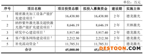 德龙激光本次发行募集资金总额为7.80亿元,募集资金净额为7.14亿元。德龙激光最终募集资金净额比原计划多2.64亿元。4月26日,德龙激光披露的招股说明书显示,公司拟募集资金4.50亿元,分别用于精密激光加工设备产能扩充建设项目、纳秒紫外激光器及超快激光器产能扩充建设项目、研发中心建设项目、客户服务网络建设项目、补充流动资金。