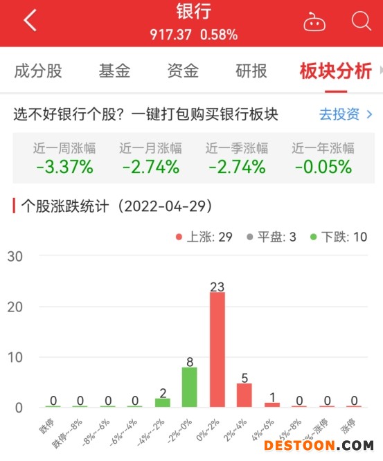 中国经济网北京4月29日讯 今日,银行板块整体涨幅0.58%,其中29只股票上涨,3只股票平盘,10只股票下跌。