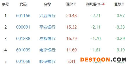 兴业银行、平安银行、成都银行、南京银行、邮储银行位列涨幅榜后五位,涨幅分别为-2.71%、-2.11%、-1.70%、-1.61%、-1.28%。