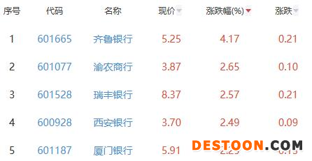 其中,齐鲁银行、渝农商行、瑞丰银行、西安银行、厦门银行位列板块涨幅前五位,涨幅分别为4.17%、2.65%、2.57%、2.49%、2.25%。