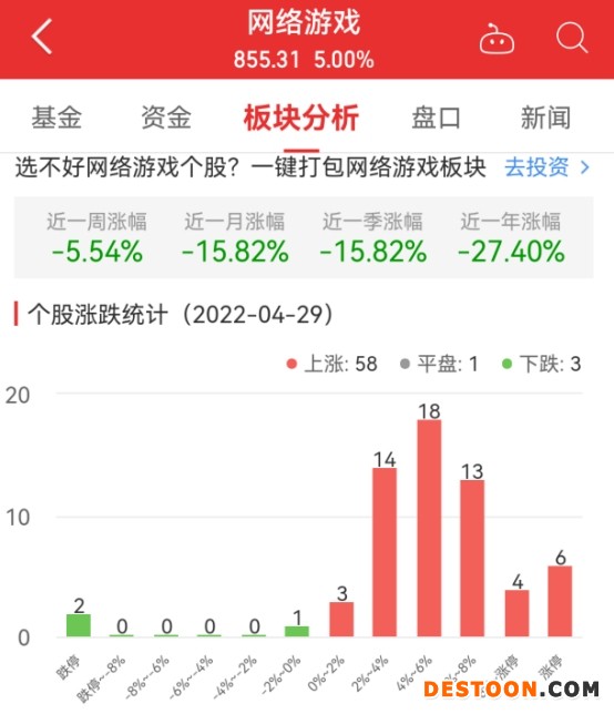 中国经济网北京4月29日讯 今日,网络游戏板块整体涨幅5.00%,其中58只股票上涨,1只股票平盘,3只股票下跌。