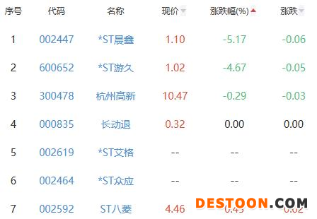 *ST晨鑫、*ST游久、杭州高新、长动退、ST八菱位列涨幅榜后五位,涨幅分别为-5.17%、-4.67%、-0.29%、0.00%、0.45%。