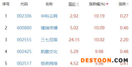 其中,中科云网、博瑞传播、三七互娱、凯撒文化、恺英网络位列板块涨幅前五位,涨幅分别为10.19%、10.09%、10.02%、9.98%、9.98%。