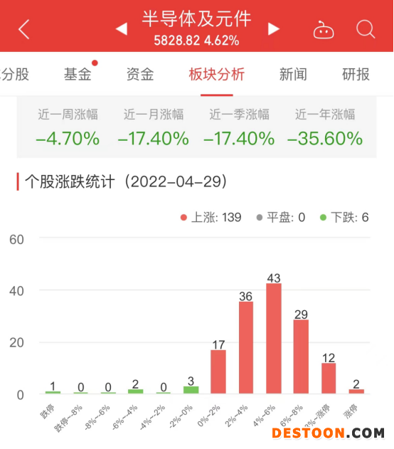 中国经济网北京4月29日讯 今日,半导体及元件板块整体涨幅4.62%,其中139只股票上涨,0只股票平盘,6只股票下跌。