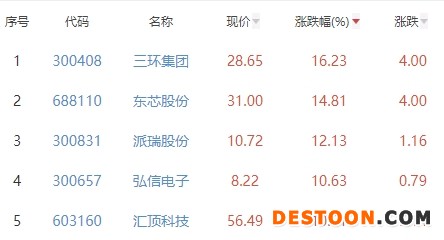 其中,三环集团、东芯股份、派瑞股份、弘信电子和汇顶科技位列板块涨幅榜前五位,涨幅分别为16.23%、14.81%、12.13%、10.63%和10.01%。