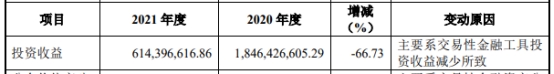 2021年,财富管理投资收益为6.14亿元,同比减少66.73%。东兴证券表示,主要系交易性金融工具投资收益减少所致。
