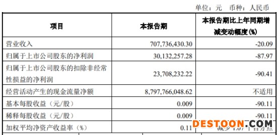 今年一季度,东兴证券实现营业收入7.08亿元,同比减少20.09%;实现归属于上市公司股东的净利润3013.23万元,同比减少87.97%;实现归属于上市公司股东的扣除非经常性损益的净利润2370.82万元,同比减少90.41%;经营活动产生的现金流量净额87.98亿元。