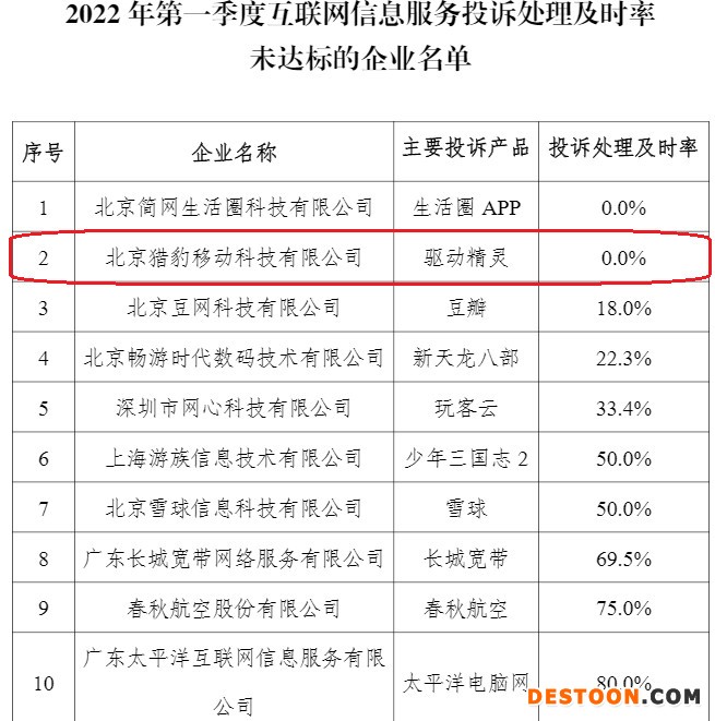 2022年第一季度互联网信息服务投诉处理及时率未达标的企业名单显示,北京猎豹移动科技有限公司旗下的驱动精灵位列主要投诉产品,投诉处理及时率0.0%。