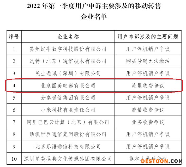 2022年第一季度用户申诉主要涉及的移动转售企业名单显示,北京国美电器有限公司用户申诉涉及的主要问题为流量收费争议。