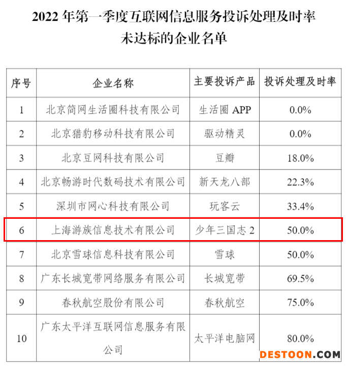 其中,上海游族信息技术有限公司登榜2022年第一季度互联网信息服务投诉处理及时率未达标的企业名单,位居第六位。其主要投诉产品为少年三国志2,投诉处理及时率为50.0%。