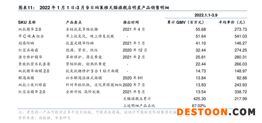 另据华泰证券研报数据,2022年1月1日-3月9日,珀莱雅天猫旗舰店明星产品销售明细中,羽感防晒产品累计GMV达4100万元,位列全店第三,在它之前的是双抗精华2.0和早C晚A护肤组合。