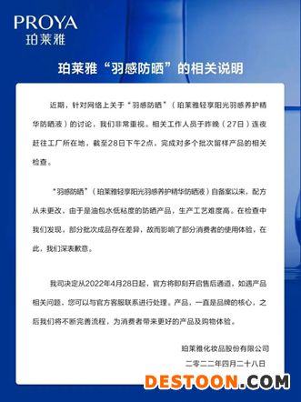4月28日下午,珀莱雅官方微博就消费者针对产品“羽感防晒”的讨论发布相关说明,珀莱雅承认该产品因生产批次差异而影响了消费者试用体验,并向消费者致歉,即日起开启售后通道。
