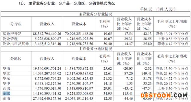 一个更加让人惊讶的事实是,金地集团在全国十多个城市的市场排名位列前十,其中在大本营外的上海、金华、呼和浩特、徐州、昆山的市占率均排在第一位。但除了上海,目前其他城市均已遭遇了发展的困境,房地产销售额和销售面积都出现了不小的下滑。与此同时,在分地区营业收入构成中,东北地区营收增长率高居第一,达141.81亿元,毛利率也遥遥领先于其他地区,达34.95%。