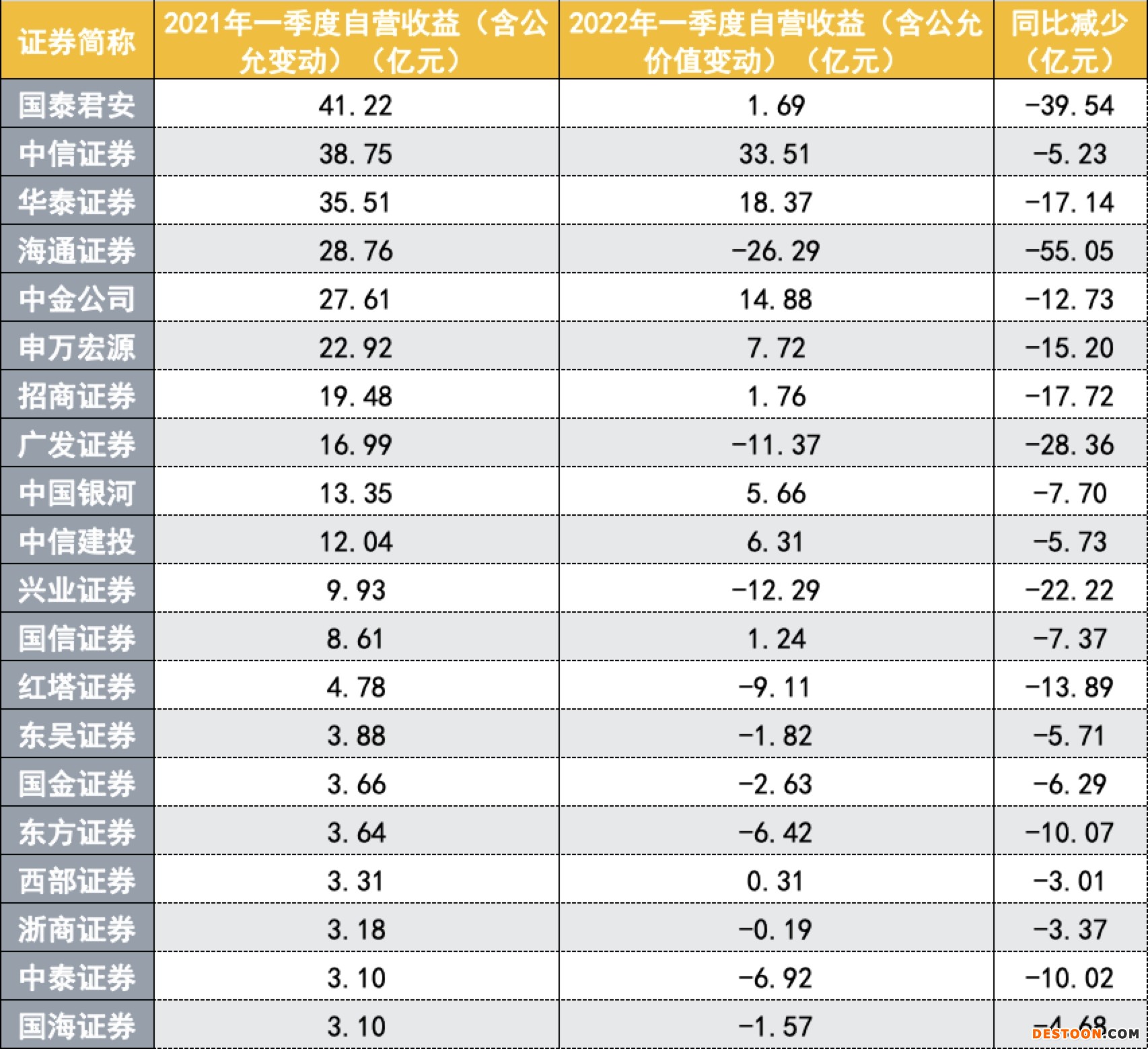 2022年一季度,中信证券实现自营收入33.51亿元,同比微降13.51%;华泰证券一季度自营收入18.37亿元;中金公司自营收入14.88亿元,这三家券商一季度自营收益均超过十亿。