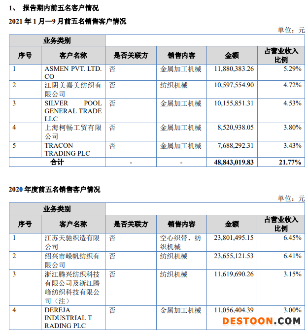 值得注意的是,有部分客户成立不久即与薪泽奇开展大额合作。其中,江阴美嘉美纺织有限公司(以下简称“美嘉美”)2020年10月成立,位列公司2021年1~9月第二大客户,销售金额1059.76万元;绍兴市嵘帆纺织有限公司(以下简称“嵘帆纺织”)成立于2019年5月,位列公司2019年第一大客户和2020年第二大客户,销售金额分别为2285.58万元、2365.51万元;浙江腾兴(峰)纺织科技有限公司(以下简称“腾兴(峰)纺织”)成立于2018年12月及2018年7月,位列公司2020年第三大客户,合计销售金额1161.97万元。
