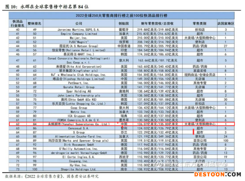 德勤(Deloitte)发布《2022全球零售力量》报告,数据统计出全球250强零售榜单。永辉在全球零售250强榜单中排名较去年上升8位至第84位。