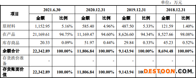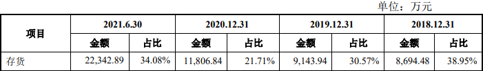 2018年至2021年1-6月,楚环科技存货账面价值、余额分别为8,694.48万元、9,143.94万元、11,806.84万元、22,342.89万元,占流动资产比例分别为38.95%、30.57%、21.71%、34.08%。