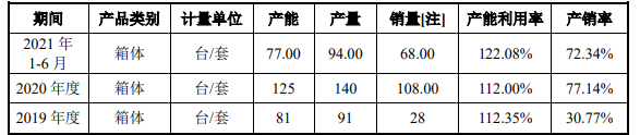 2019年至2021年1-6月,楚环科技箱体产能利用率分别为112.35%、112.00%、122.08%,产销率分别为30.77%、77.14%、72.34%。