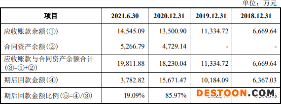 2018年至2021年1-6月,楚环科技应收账款余额分别为6,669.64万元、11,334.72万元、13,500.90万元、14,545.09万元,2020年、2021年1-6月合同资产(应收质保金) 分别为4,729.14万、5,266.79万元,合计占营业收入比例分别为34.84%、43.90%、45.43%、48.09%。