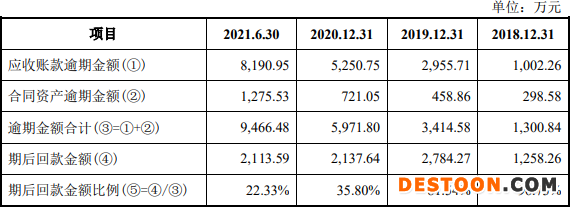 2018年至2021年1-6月,楚环科技应收账款逾期金额分别为1,002.26万元、2,955.71万元、5,250.75万元、8,190.95万元,合同资产逾期金额分别为298.58万元、458.86万元、721.05万元、1,275.53万元,期后回款金额分别为1,258.26万元、2,784.27万元、2,137.64万元、2,113.59万元,期后回款金额比例分别为96.73%、81.54%、35.80%、22.33%。