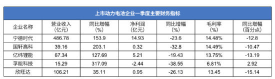 据悉,全球动力电池装机量排名第二的LG新能源一季报显示,公司一季度营业利润同比下降24.1%至2589亿韩元(约合人民币13.4亿元),销售额为4.34万亿韩元(约合人民币224.8亿元),同比增长2.1%;国轩高科一季报,公司实现营收39.16亿元,同比增长203.14%,但净利润仅为3220.37万元,同比下滑32.79%,报告期内,公司营业成本高达33.49亿元,较上年上升245.44%;亿纬锂能在一季度营收同比增长127.69%至67.34亿元,而净利润同比下滑19.43%,达5.21亿元。