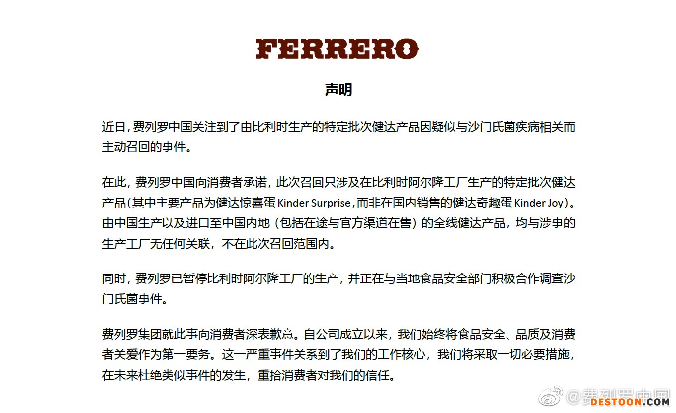 4月9日,费列罗中国微博发布声明回应费列罗巧克力涉嫌沙门氏菌感染:费列罗中国向消费者承诺,由中国生产以及进口至中国内地(包括在途与官方渠道在售)的全线健达产品,均与涉事的比利时生产工厂无任何关联,不在此次召回范围内。