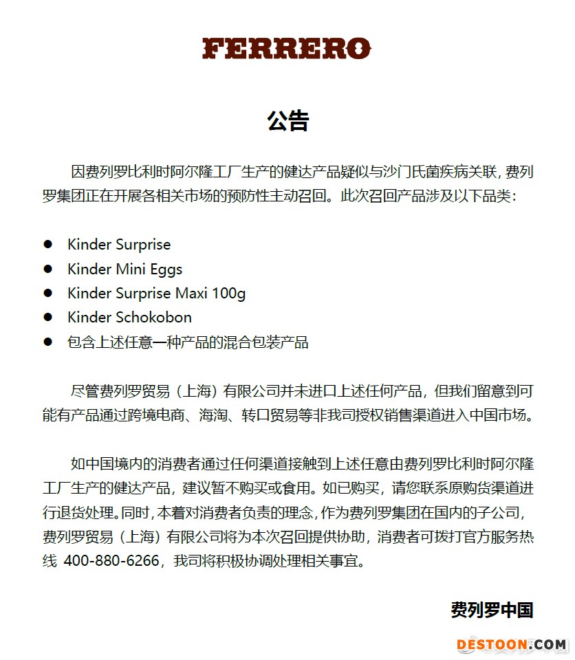 4月14日,费列罗中国微博发布消息称,针对疑似与沙门氏菌疾病关联的比利时产的健达产品,费列罗集团目前正在相关市场开展预防性主动召回。费列罗中国留意到部分产品可能通过跨境电商、海淘、转口贸易等非我司授权销售渠道进入中国市场。本着对消费者负责的理念,我司将对该部分产品的召回提供协助。