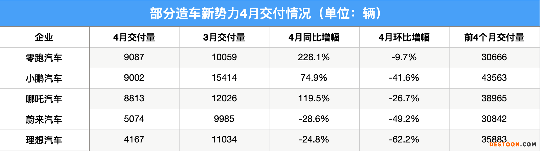 公开数据显示,4月,零跑汽车交付量为9087辆,环比微降9.7%,但实现连续13个月同比增长超200%,并首次获得造车新势力月度交付量冠军。今年1~4月,零跑汽车累计交付约3.07万辆。