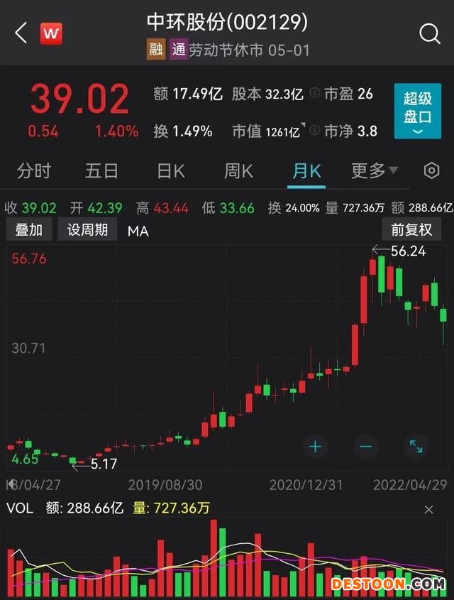 中环股份为过去几年的大牛股,2018年11月-2021年8月,在不到三年的时间里,中环股份成为十倍大牛股,累计涨幅接近1000%。Wind数据显示,中环股份最新股价为39.02元/股,市值为1261亿元。