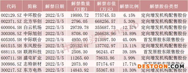 具体来看,中环股份5月5日将解禁1.99亿股,北方华创5月5日将解禁2796.5万股。白云机场5月5日将解禁2.97亿股,均为定向增发机构配售股份。