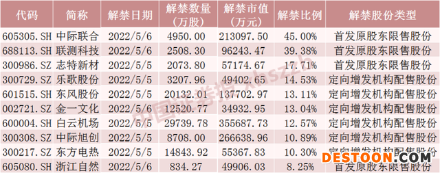 从解禁股情况来看,中环股份、北方华创、白云机场将解禁金额超30亿元,中际联合、联测科技流通盘将增加超100%。