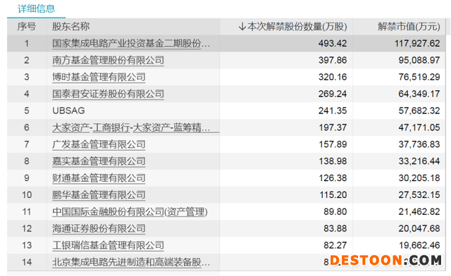 解禁市值第二的北方华创为半导体龙头股,解禁的股份来自于北方华创2021年11月完成的定增,为国家集成电路产业投资基金二期、南方基金、博时基金等众多机构所持有,彼时北方华创的定增发行价为304元/股。