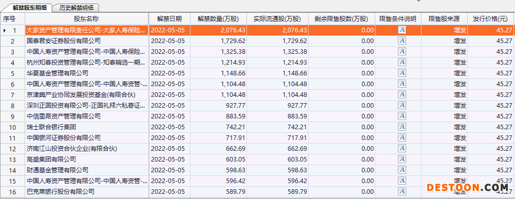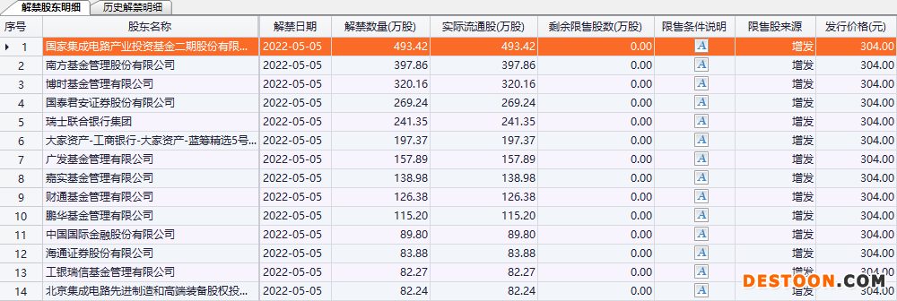 此外,芯片半导体龙头北方华创周四也将出现解禁,本次解禁比例为5.30%,解禁市值66.82亿元。解禁股东为国家大基金二期、南方基金、博时基金等机构投资者。本次解禁为北方华创在2021年11月4日的定增,当时的定增价格为304元/股,共增发2796万股,按照北方华创上周五收盘价239元/股计算,所有参与的增发机构目前浮亏超20%。