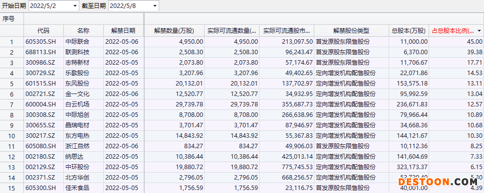 数据显示,下周将有10家公司解禁比例占总股本比例超过10%,其中有5家是创业板公司。解禁比例最大的是主板的中际联合,解禁比例达45%,解禁市值为21.31亿元;科创板公司联测科技紧随其后,解禁比例达39.38%,解禁市值为9.62亿元。