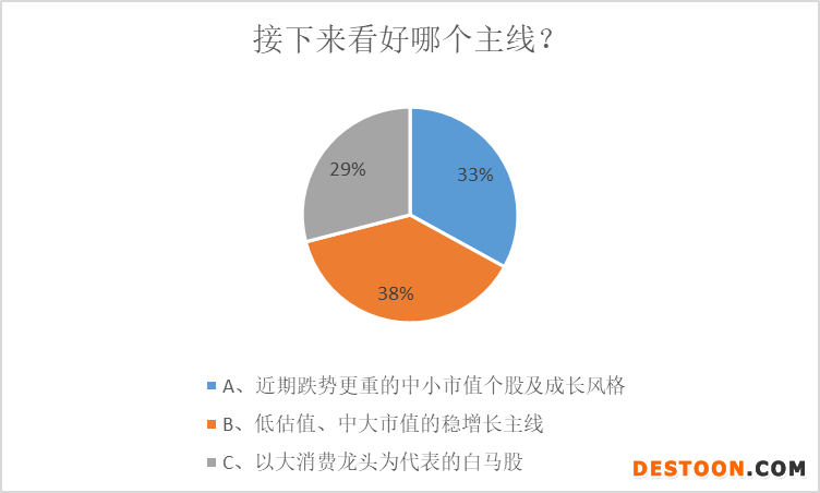 不过,对于接下来看好哪个主线,私募排排网调查数据显示,私募的分歧较为明显。其中,38%的私募看好低估值、中大市值的稳增长主线,33%的私募看好近期跌势更重的中小市值个股及成长风格,另有29%的私募看好以大消费龙头为代表的白马股。