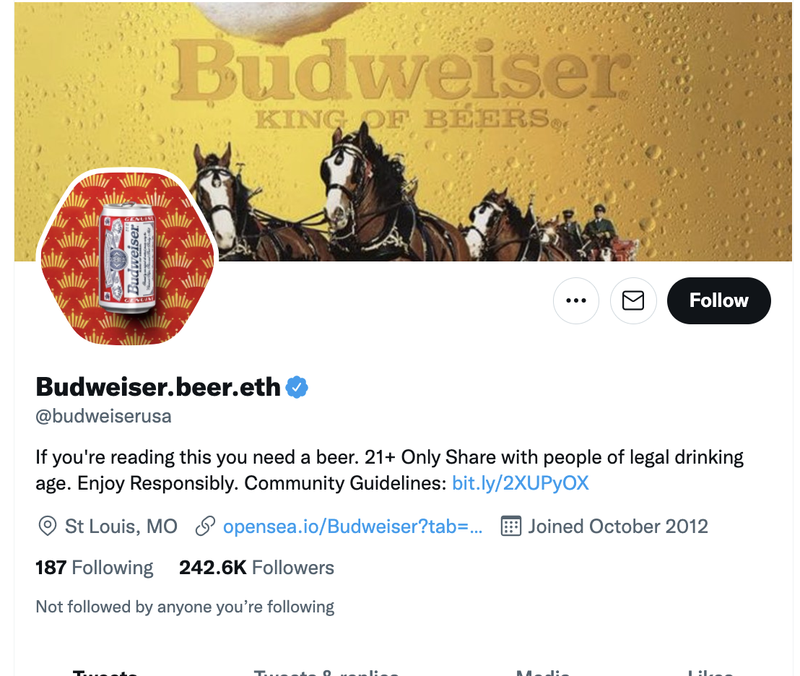 许多知名人物使用他们的 ENS 名称作为推特用户名,如以太坊创始人 Vitalik Buterin (vitalik.eth)、前篮球运动员奥尼尔(shaq.eth)等。品牌也有所动作,百威啤酒曾以30eth的价格收购了ENS域名Beer.eth,彪马也将其推特账户名改为了Puma.eth。
