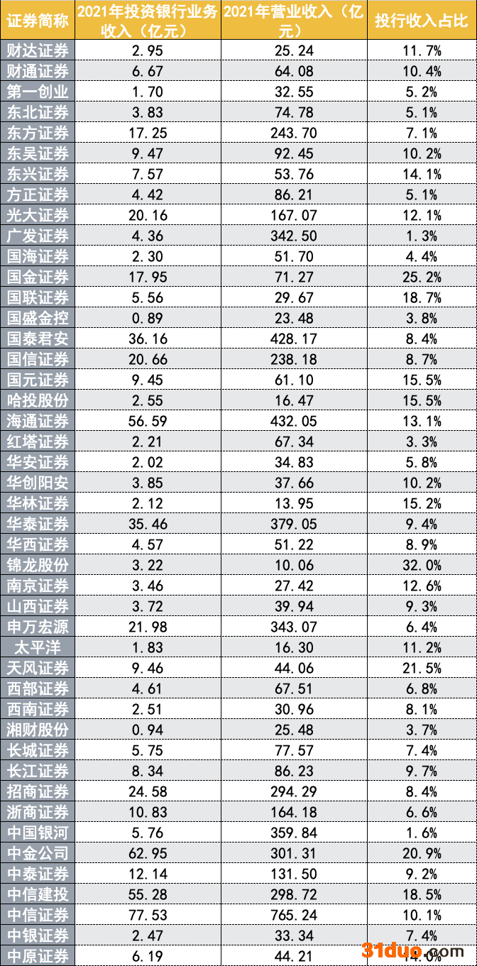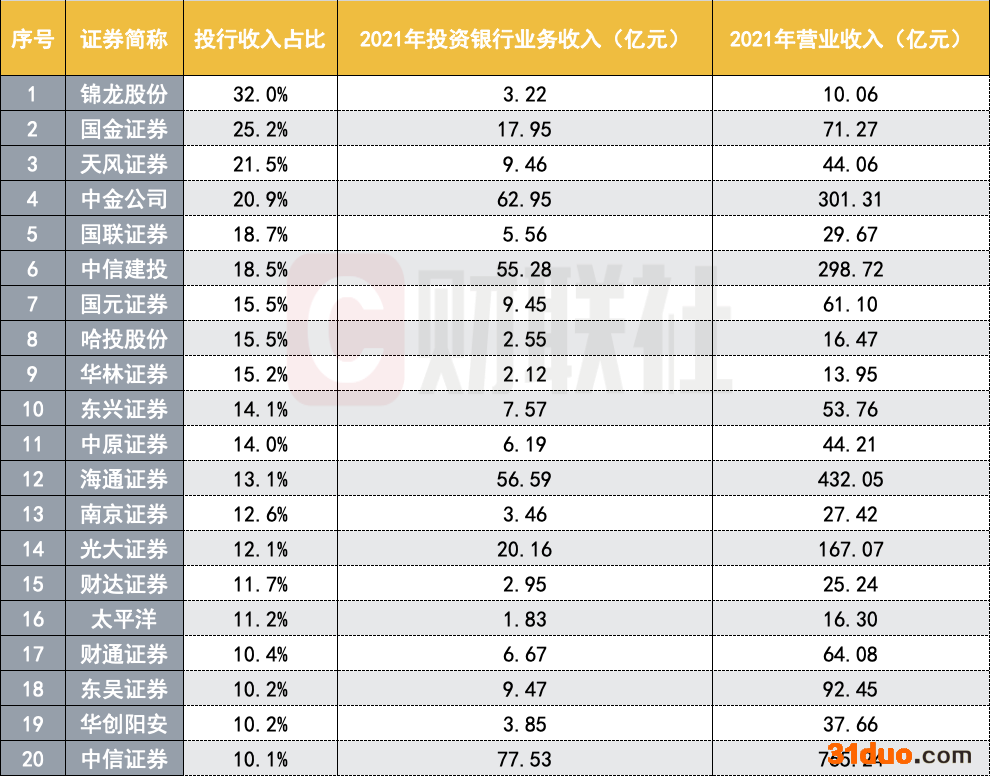 哪些券商高度依赖投行业务?从投行收入贡献比来看,2021年4家投行的收入占比超过20%,头部投行中尤以中金公司为首,去年投行收入贡献了20.9%,在上市券商中居第4位。锦龙股份投行收入占比32%,在45家上市券商中居首,国金证券、天风证券的投行收入分别贡献了25.2%、21.5%,分别排名第2、3位。
